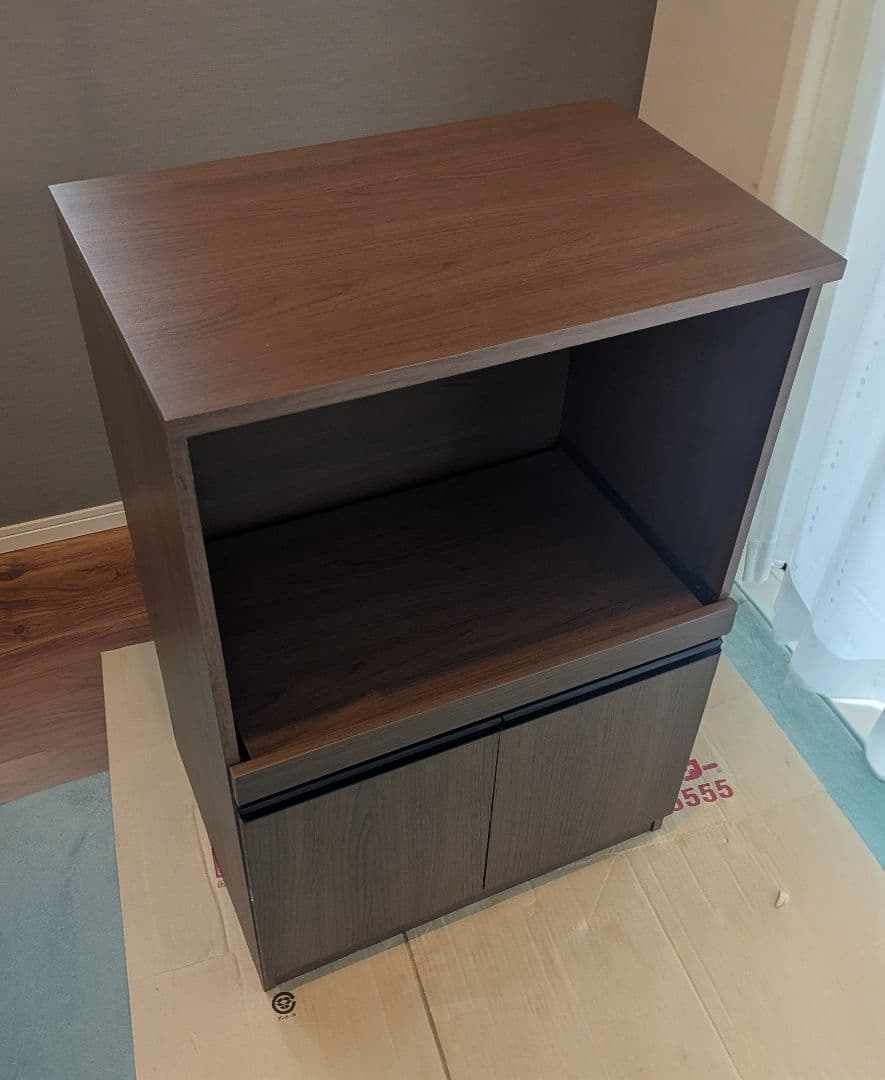 - 組立不要な点と下の収納が大きいので使い勝手はとてもいいです。 ただ、私はヘルシオを上においているのですが、ぐらつきが気になります。 ヘルシアくらいおもいものをおいてもぐらつくので、地震がきたらと少し不安です。 それ以外の点はとても使いやすいので3点です。